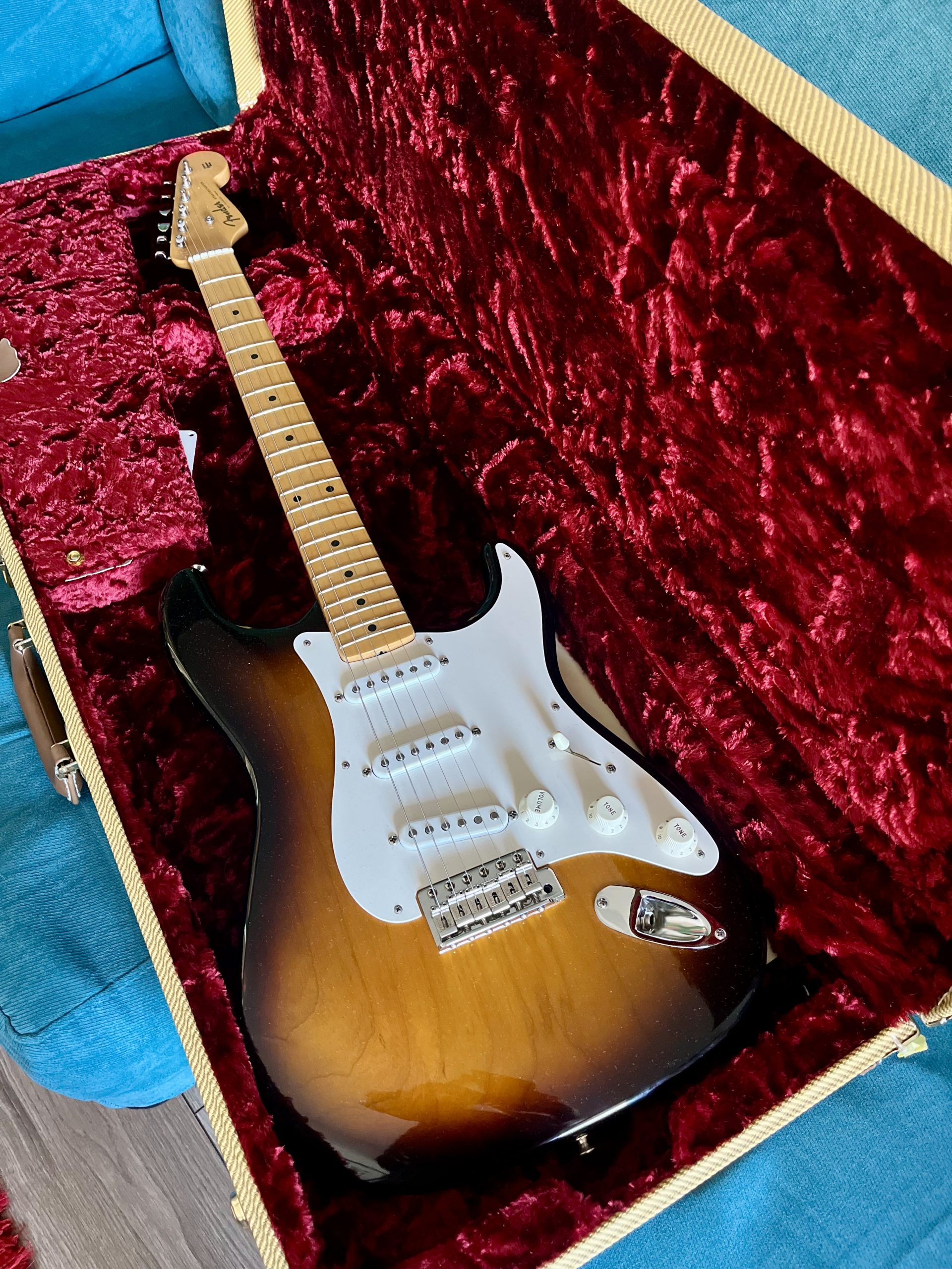 I’m offering for sale an exceptionally special and rare instrument: a Fender Stratocaster 60th Anniversary American Vintage ’54, a faithful reissue of the legendary original 1954 Stratocaster.